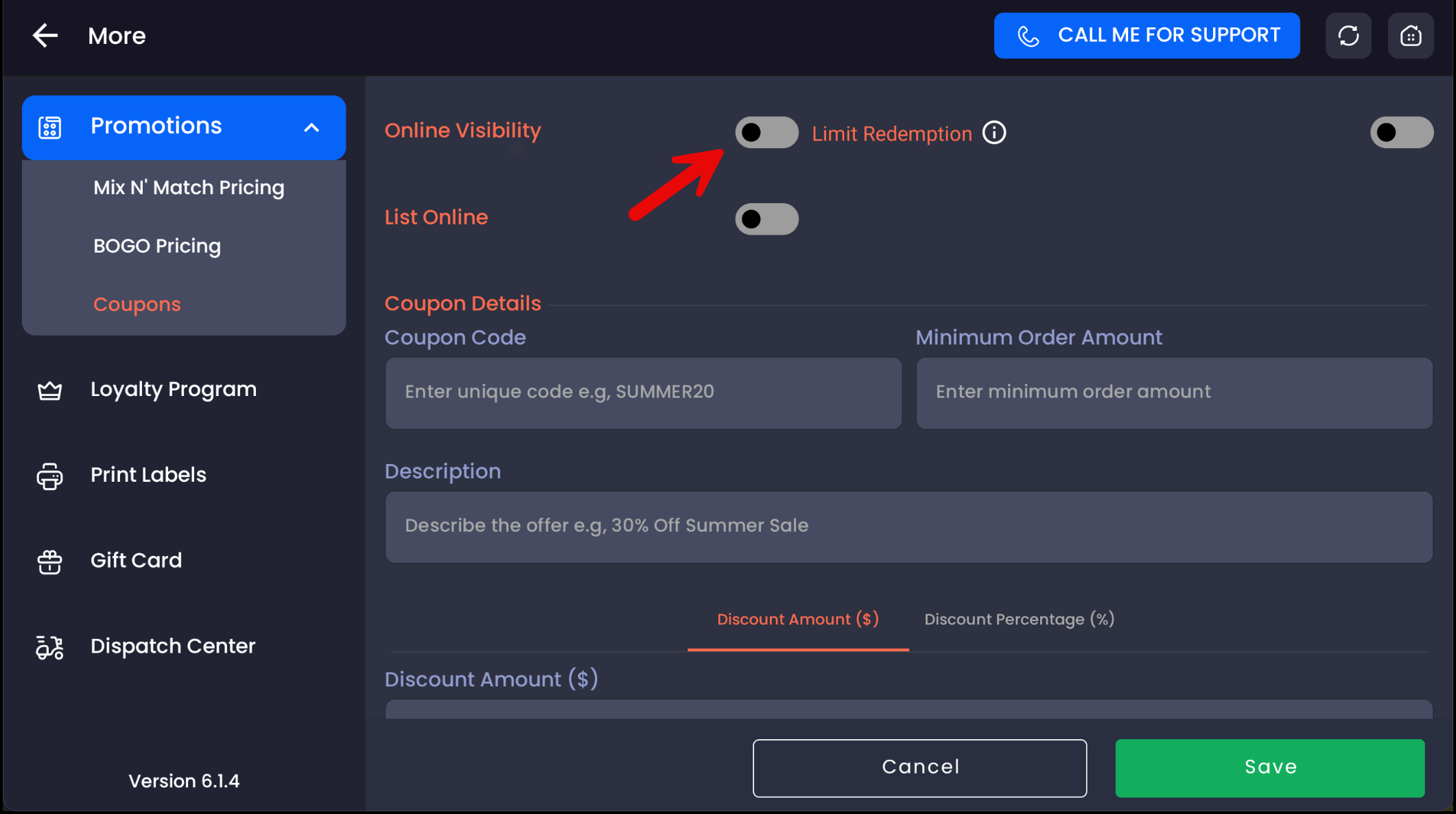 Toggle visibility if you want the coupon to appear online.