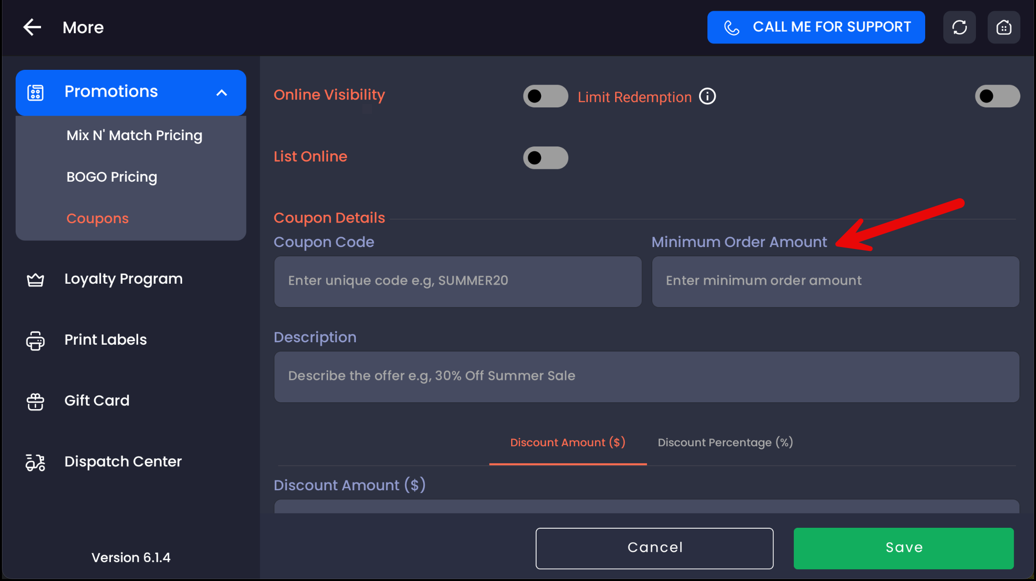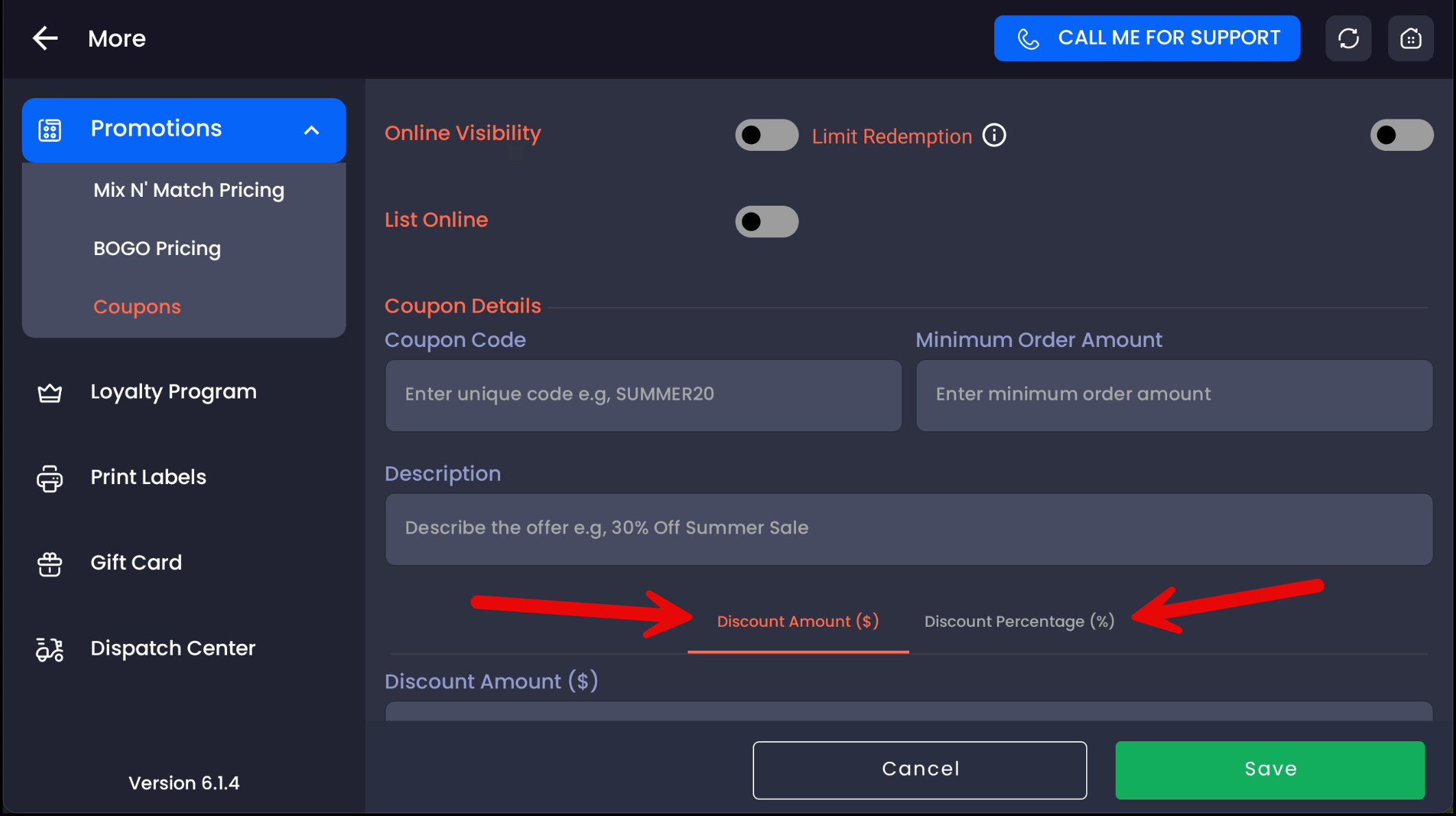 Choose if the discount is a $ amount or % off.