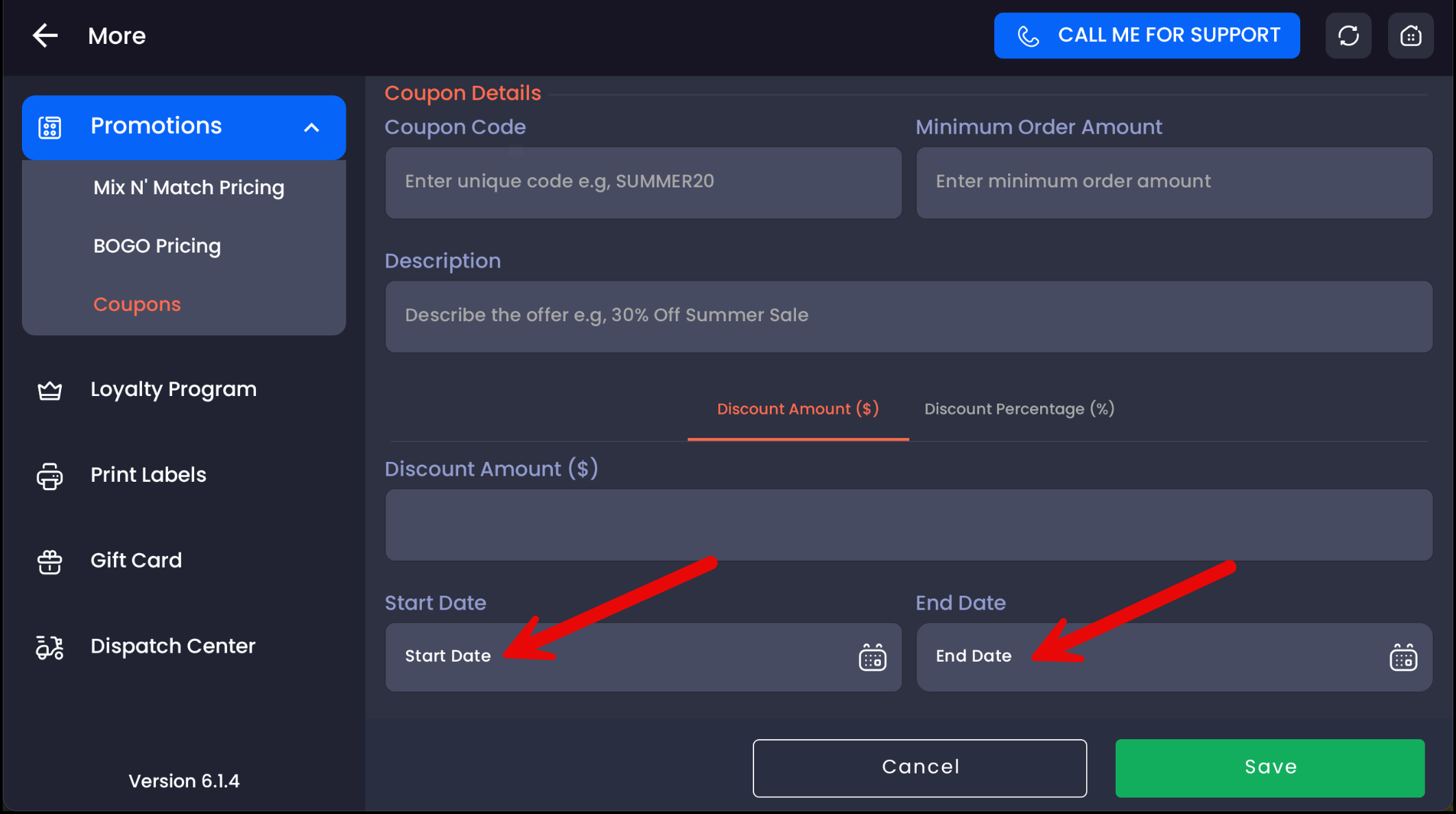 Select a start date and an end date for the coupon.
