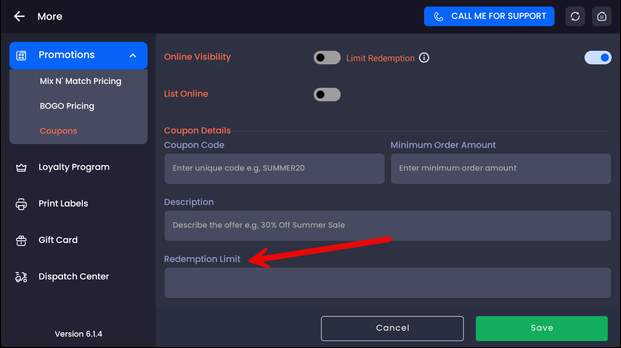 Enable or disable a redemption limit.