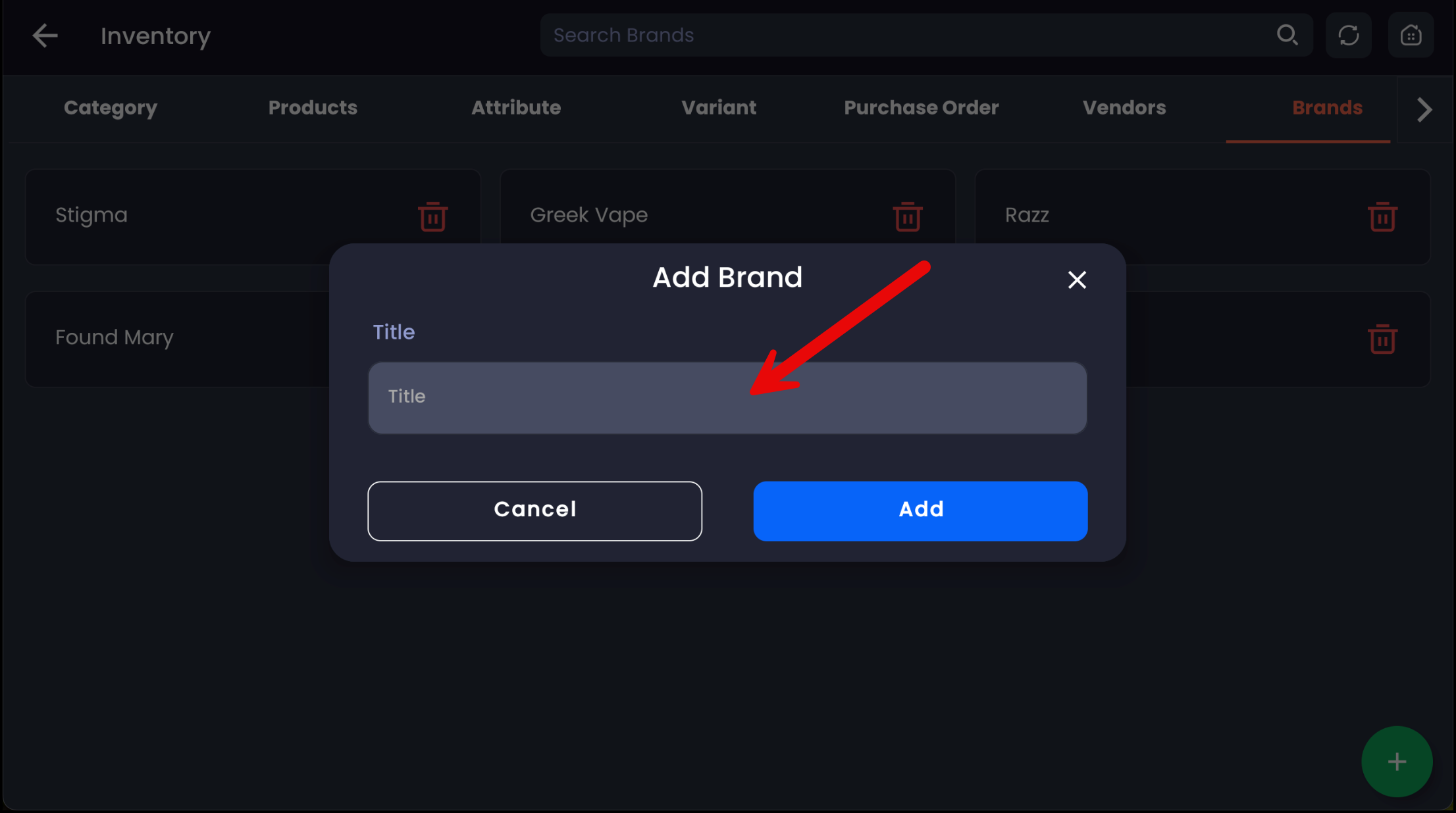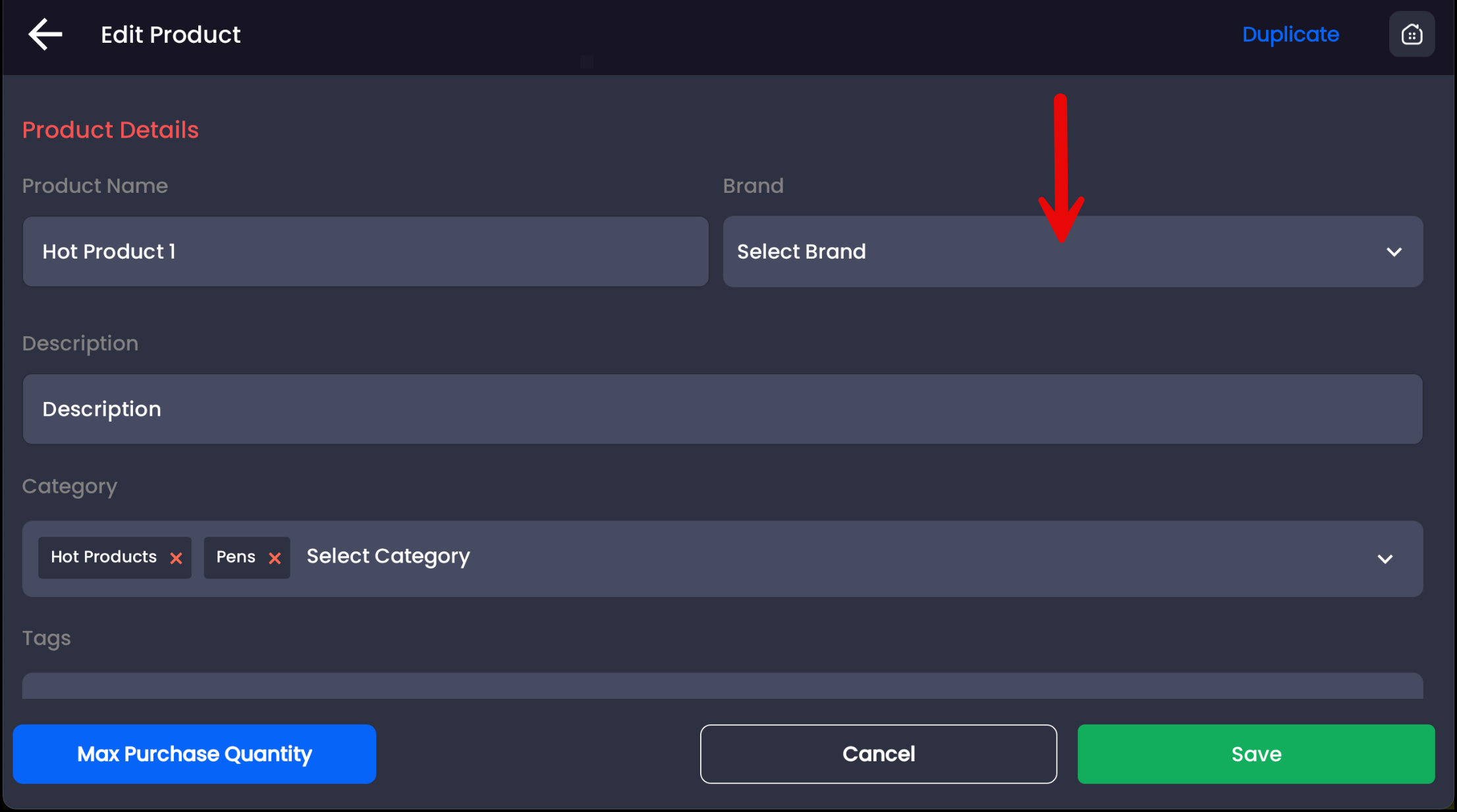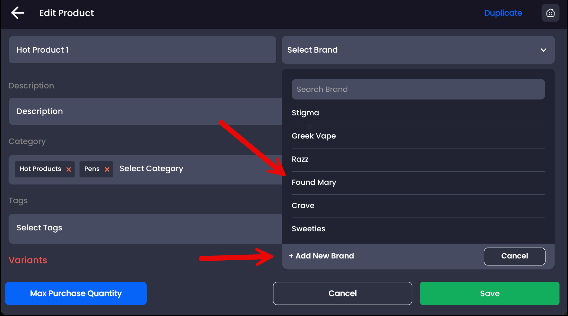 From the dropdown, tap the brand you want to assign this product to. You also have the option at the bottom of this dropdown to tap + Add New Brand to quick add a brand.