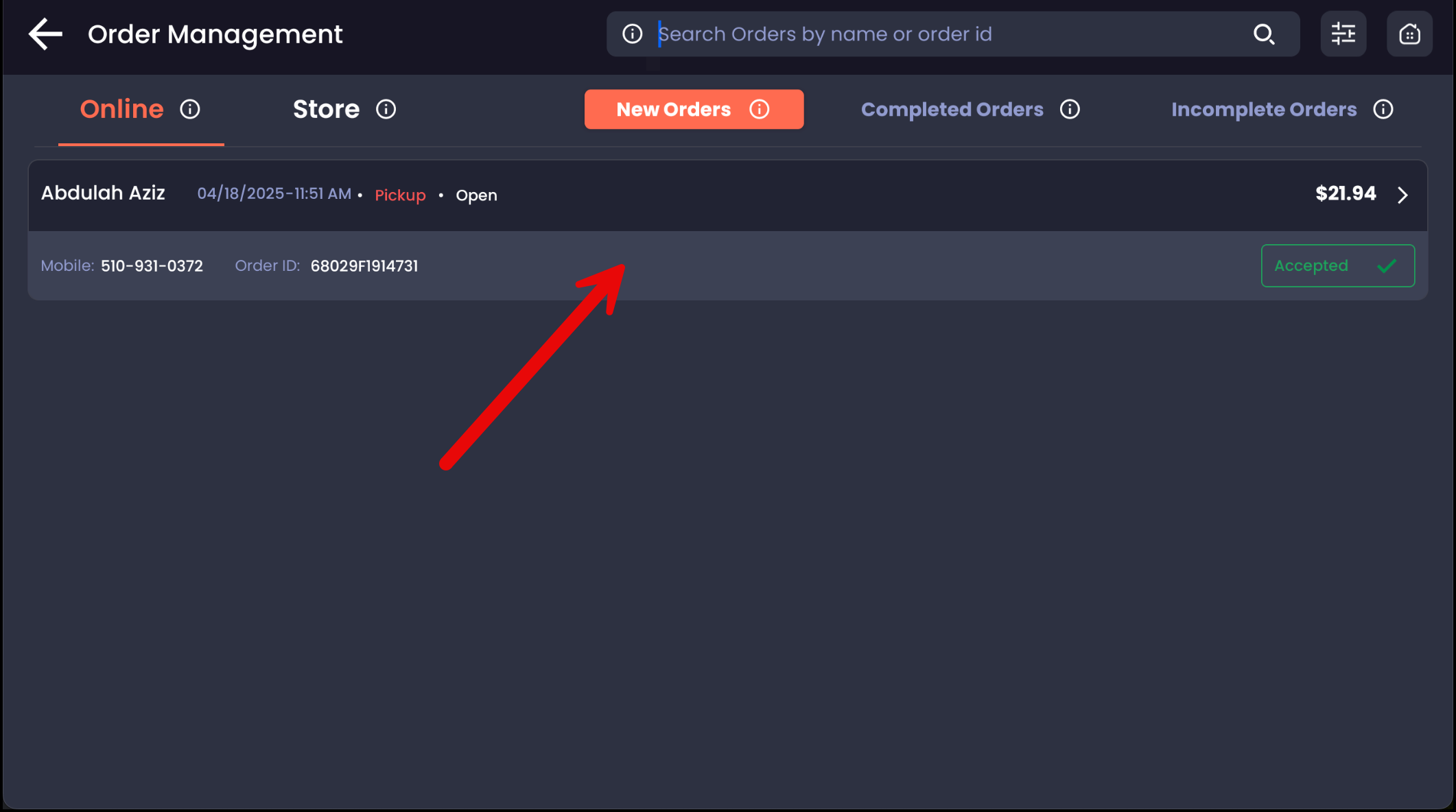 Under the Online Orders tab, tap the order you would like to update.