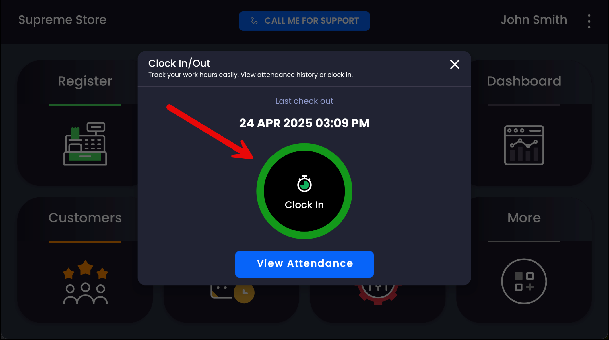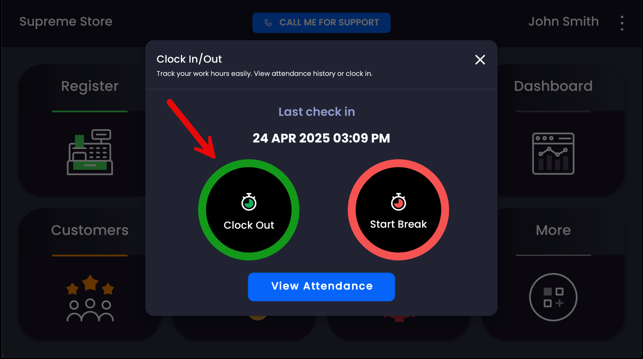 ➡️ To clock out, follow the same steps — if already clocked in, the option will display as Clock Out instead.