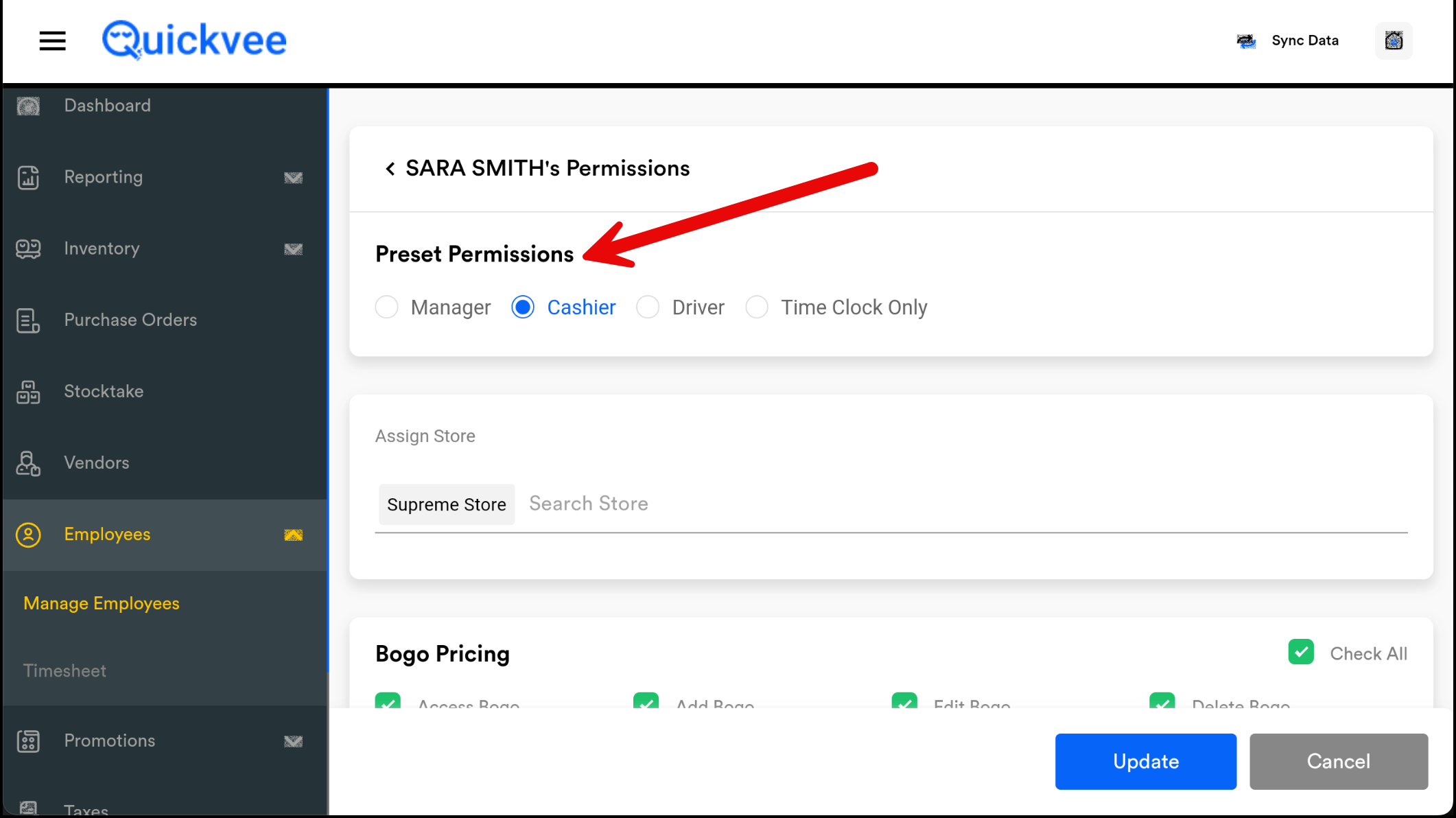 Under Preset Permissions, choose a role (e.g., Cashier, Manager) to quickly assign default permissions.