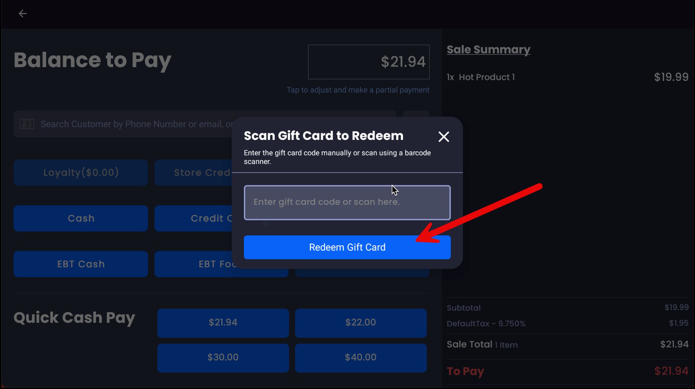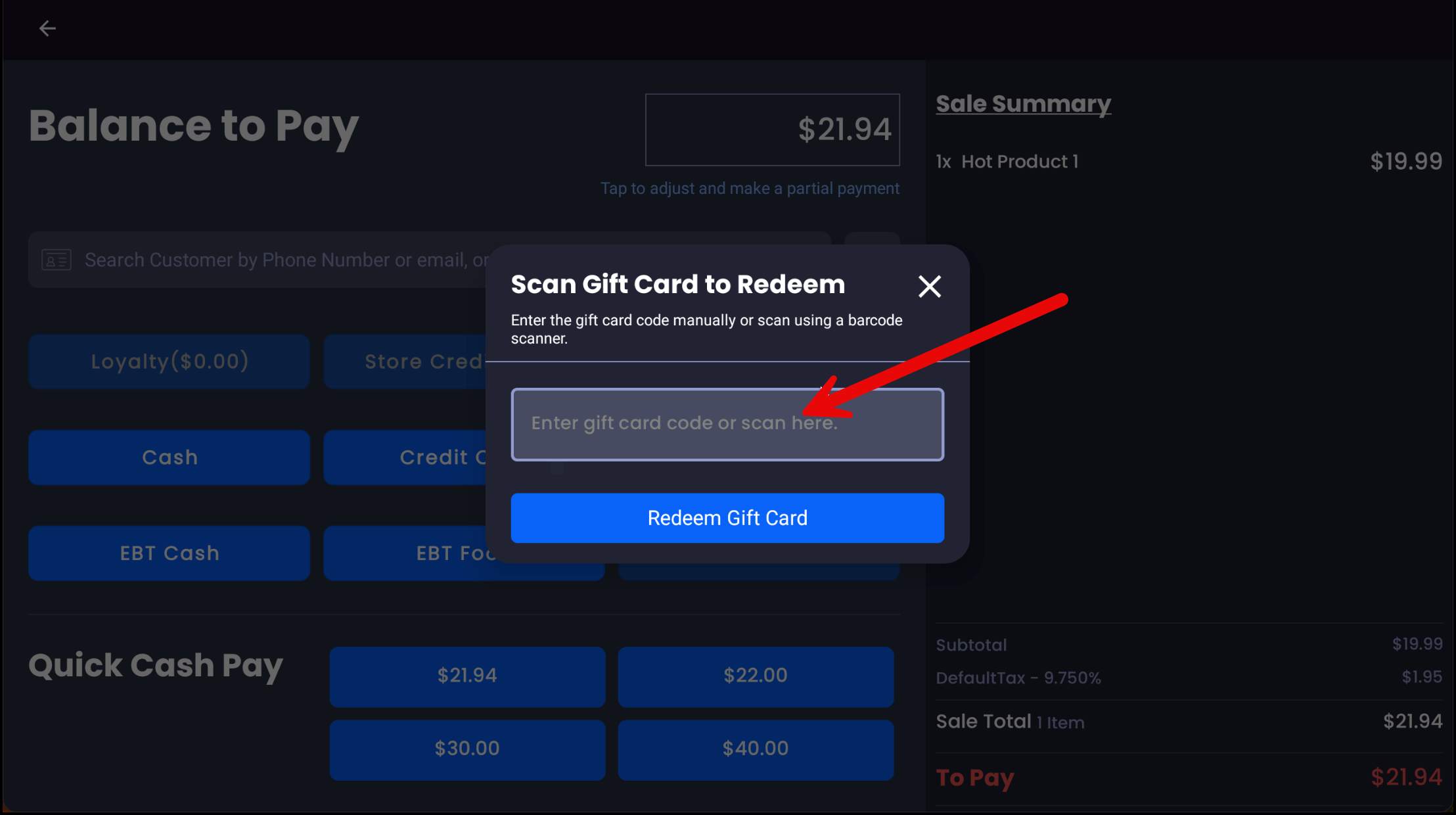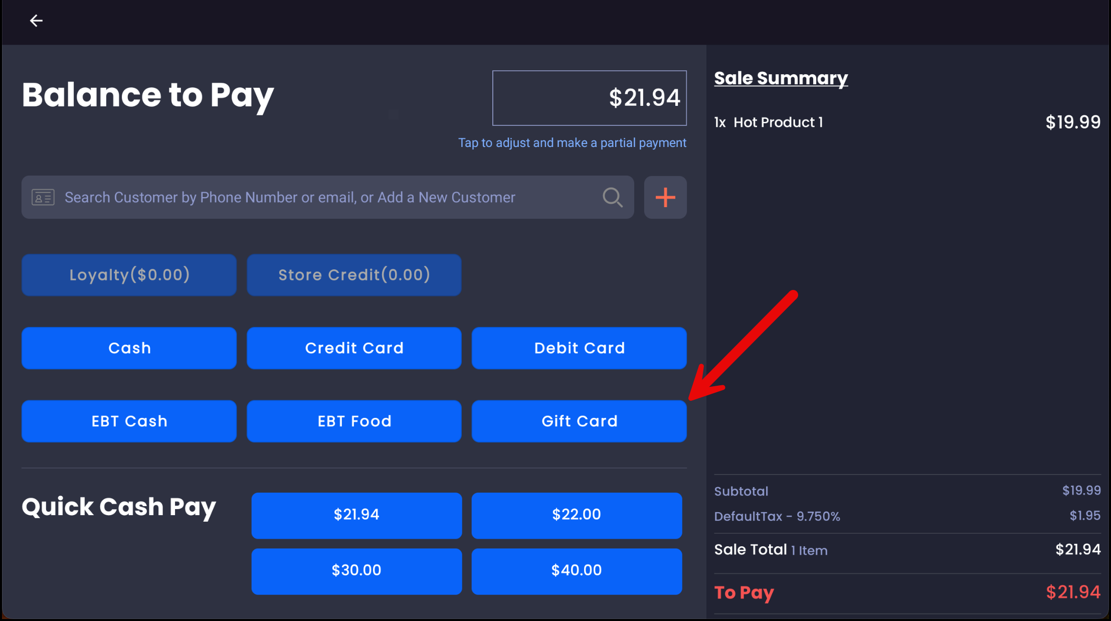 - On the Payment Screen, tap Gift Card.