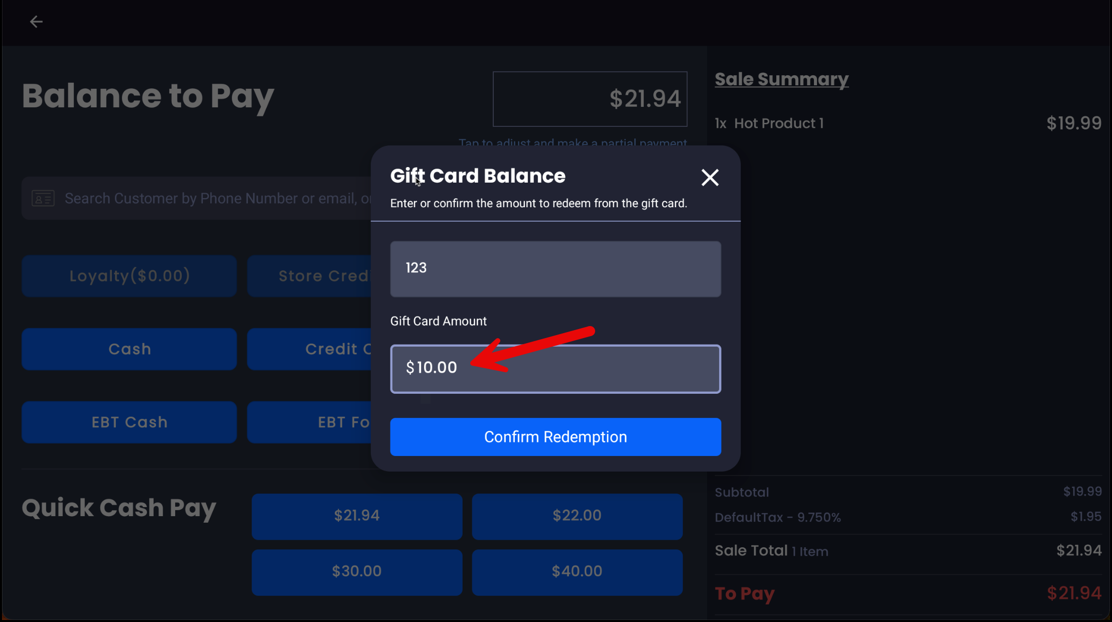 - The total available balance on the gift card will now be displayed.