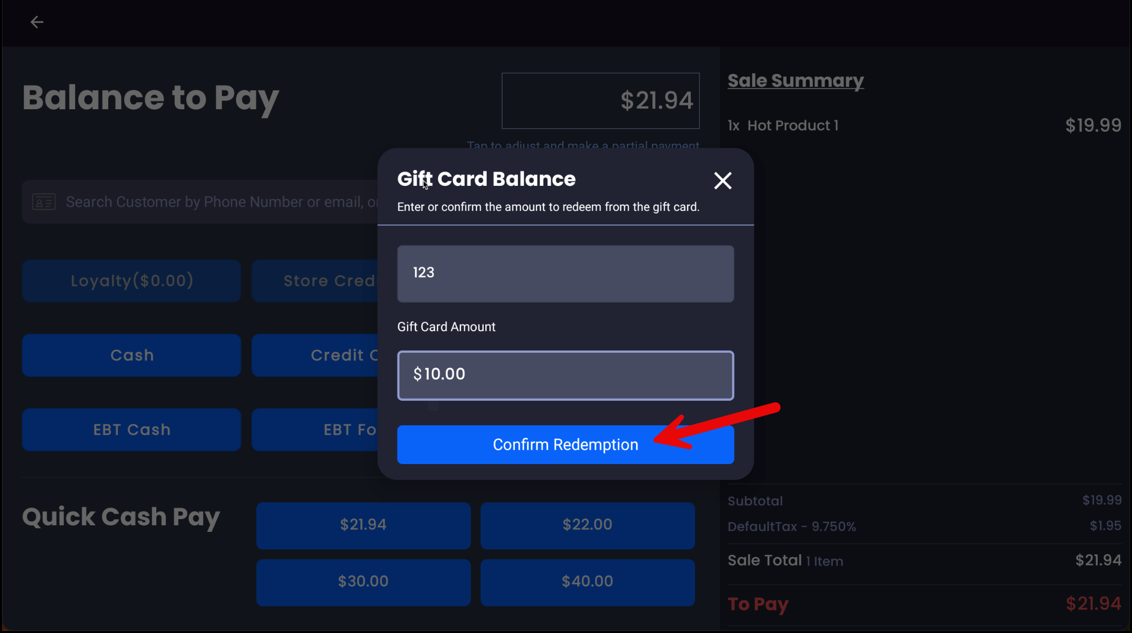 - If the gift card covers the full total, the transaction will complete after confirming redemption.